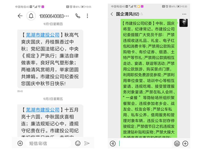 發(fā)送廉政短信。中秋國慶前期和期間,公司紀(jì)委向全體干部員工及控股企業(yè)領(lǐng)導(dǎo)班子成員累計(jì)發(fā)送廉政短信348條次,通過企業(yè)微信群累計(jì)發(fā)送廉政提醒14次,在表達(dá)節(jié)日祝福的同時(shí),提醒廣大領(lǐng)導(dǎo)干部嚴(yán)格遵守廉潔自律各項(xiàng)規(guī)定,繃緊廉潔自律這根弦,筑牢拒腐防變這道防線。