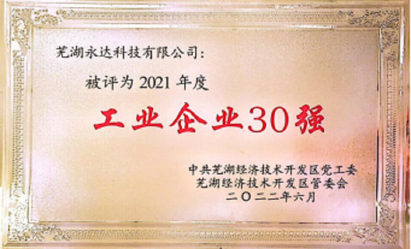 2022年6月9日下午,在蕪湖經(jīng)濟(jì)技術(shù)開(kāi)發(fā)區(qū)管委會(huì)一樓多功能廳,蕪湖永達(dá)科技有限公司在“蕪湖經(jīng)濟(jì)技術(shù)發(fā)開(kāi)區(qū)2022年度企業(yè)發(fā)展大會(huì)”上,榮獲“蕪湖經(jīng)濟(jì)技術(shù)開(kāi)發(fā)區(qū)2021年度工業(yè)企業(yè)30強(qiáng)”榮譽(yù)稱(chēng)號(hào)。