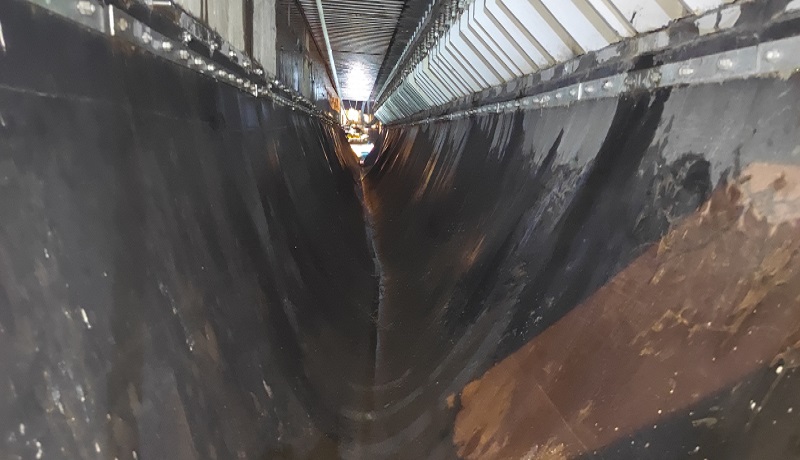 蕪湖長江三橋主橋0#、5#墩處采用最大伸縮量為1200mm的梳齒形伸縮縫,齒間距約50mm,通過橡膠止水帶收集雨水后排至兩側(cè)雨水斗進(jìn)入雨水系統(tǒng)。自三橋通車以來,車輪及雨水裹挾泥沙由梳齒間隙進(jìn)入伸縮縫,止水帶內(nèi)存有不少泥沙和雜物。隨著時間的推移,止水帶內(nèi)積沙積泥載荷增大,將會對正下方高鐵運(yùn)行產(chǎn)生威脅。為及時消除安全隱患,大橋公司路產(chǎn)安全部養(yǎng)護(hù)人員組織外協(xié)單位多次前往現(xiàn)場確定清理方案及安全防護(hù)措施,并在公司領(lǐng)導(dǎo)帶領(lǐng)下及時對接鐵路蕪湖工務(wù)段,申請高鐵運(yùn)行天窗期開展專門清理工作。