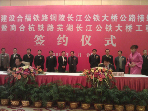 在簽約儀式上,省投資集團(tuán)公司分別與蕪湖市政府、銅陵市政府簽訂了“合作建設(shè)合福鐵路銅陵長(zhǎng)江公鐵大橋公路接線工程和商合杭鐵路蕪湖長(zhǎng)江公鐵大橋工程”框架協(xié)議;省投資集團(tuán)公司分別與蕪湖市交投公司和銅陵市交投公司簽署“合作建設(shè)合福鐵路銅陵長(zhǎng)江公鐵大橋公路接線工程合同書”。兩項(xiàng)投資協(xié)議的簽署標(biāo)志著商合杭鐵路蕪湖長(zhǎng)江公鐵大橋、合福鐵路銅陵長(zhǎng)江公鐵大橋公路接線工程兩個(gè)項(xiàng)目公司正式成立運(yùn)作,對(duì)我市實(shí)施擁江發(fā)展具有重大的戰(zhàn)略意義。